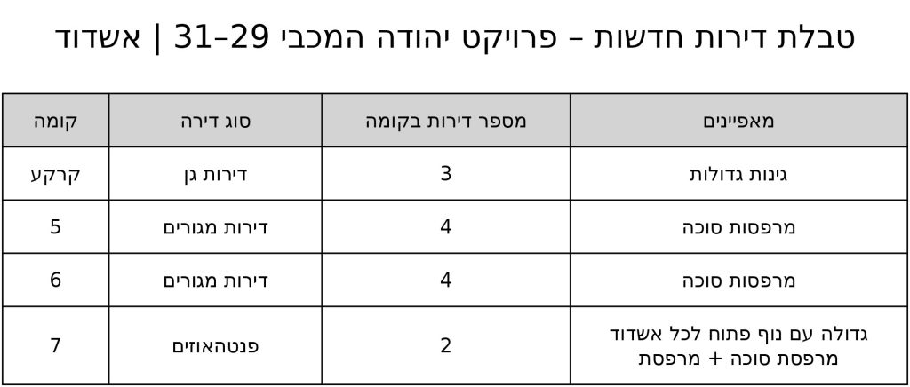 פירוט הדירות החדשות בכל בניין: • קומת קרקע – 3 דירות גן חדשות עם גינה • קומות 5–6 – דירות חדשות (4 דירות בכל קומה) • קומה 7 – 2 דירות פנטהאוז חדשות עם מרפסת המשקיפה לכל אשדוד